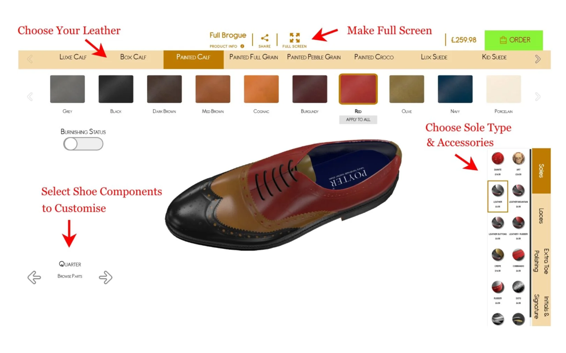 Our innovative 3D Shoe Design Tool empowers you to craft shoes as unique as you are. With countless customisation options, the only limit is your imagination. Follow this simple step-by-step guide and design the perfect pair for any occasion.