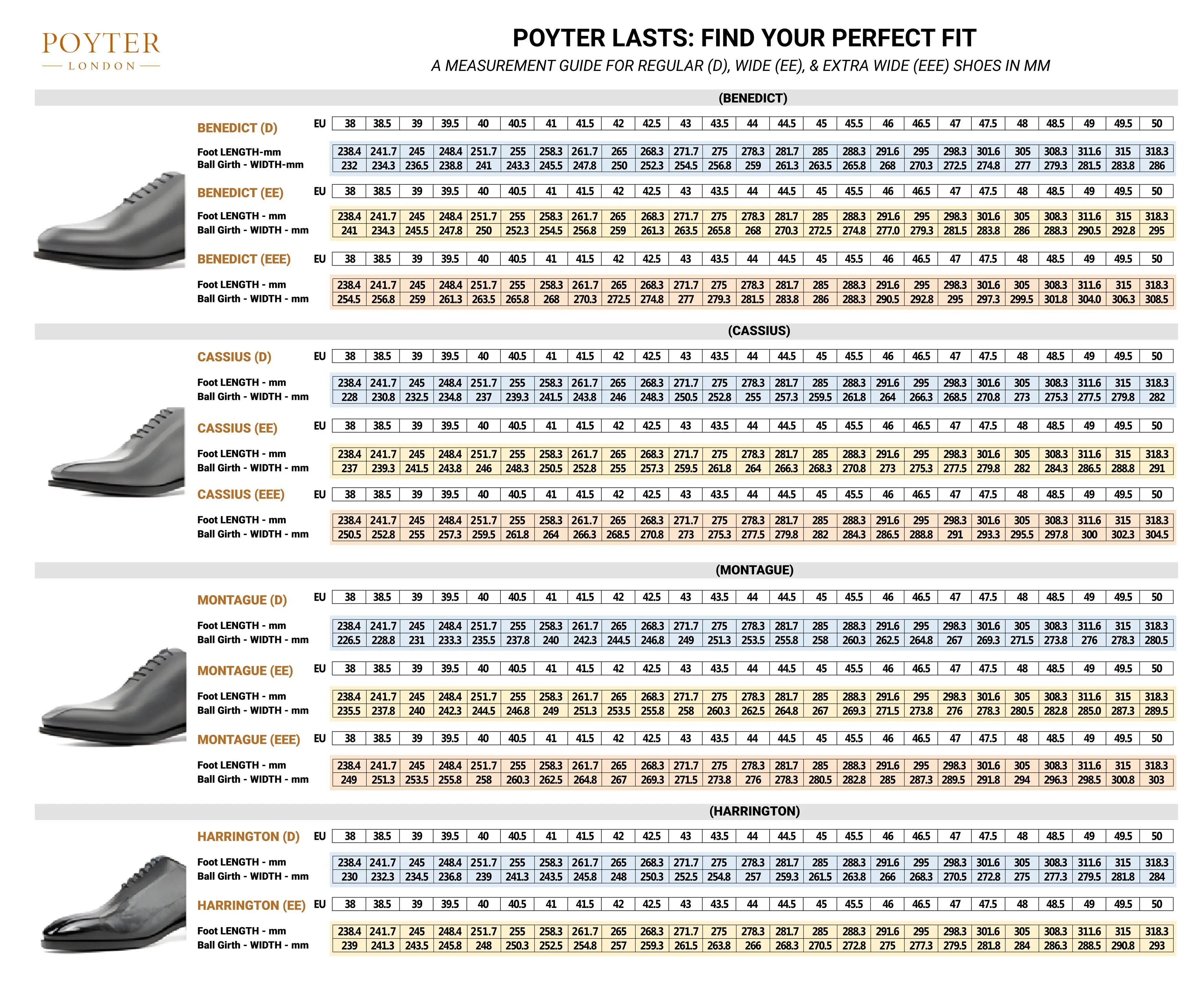 If our EE or EEE wide fit in the above chart isn’t suitable — whether due to unique foot shape or medical conditions — we’ll craft a made-to-measure shoe with a custom last. Simply provide measurements for both feet as outlined below.