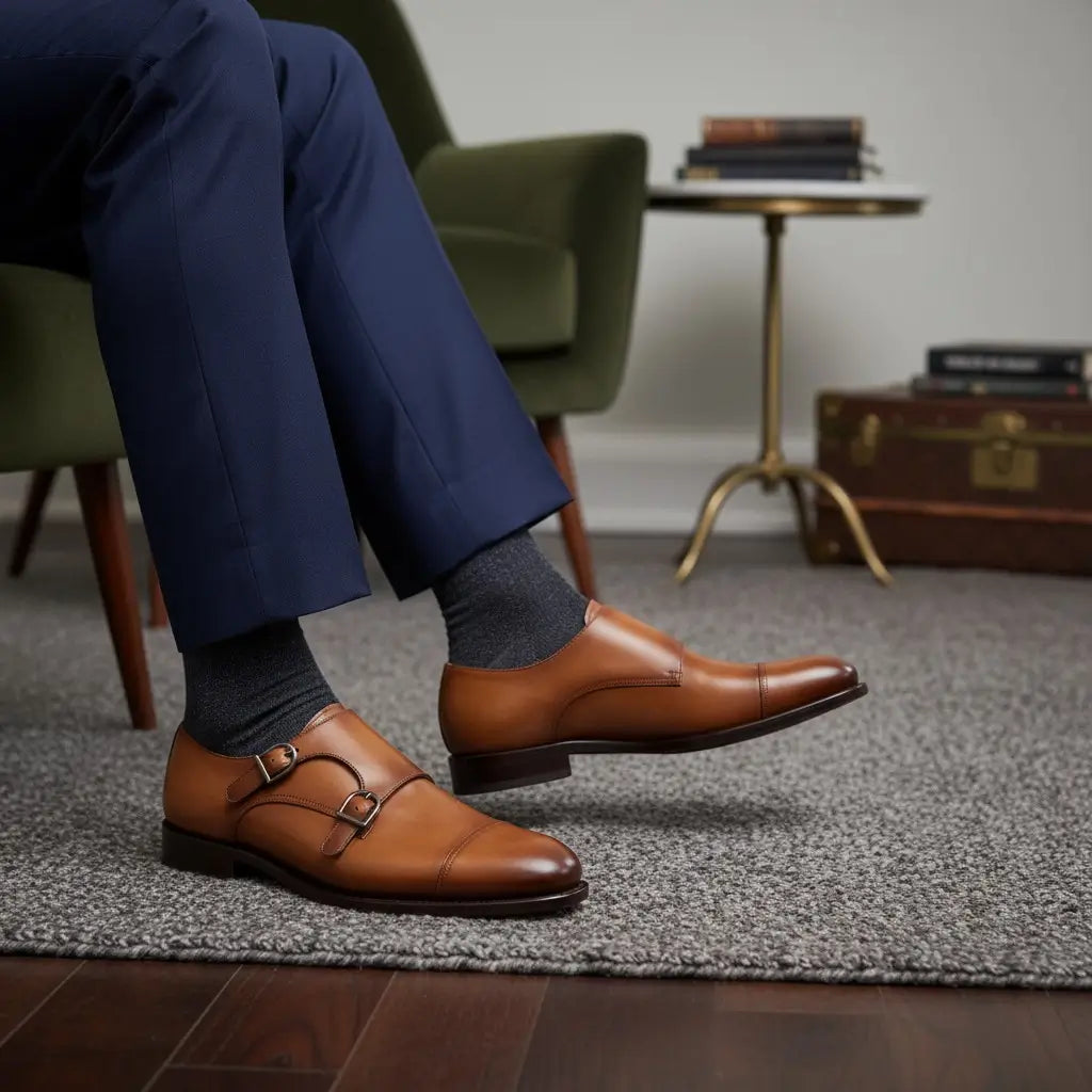 Distinctive and poised, the handmade Double Monk Strap from Poyter redefines timeless sophistication. Fashioned from premium crust calf leather, hand-painted and hand-polished to a radiant English tan patina with tonal complexity. Twin silver buckles and a refined cap toe lend modern character to its sculpted form. Every seam and proportion reflects artisanal precision, offering distinction that endures.